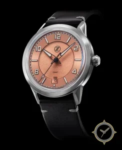 A Field watch with a bold 42.5mm presence on the wrist, crafted from stainless steel featuring a gold dial with a unique textured/grained sunburst center with smooth outer ring finish.
