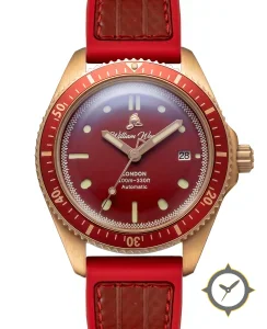 A Dive watch with a vintage-inspired 37mm case, crafted from bronze featuring a red dial with a unique glossy finish.