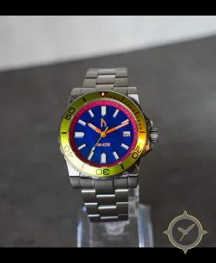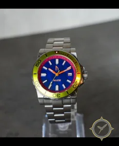 A Dive watch with a bold 47mm presence on the wrist, crafted from stainless steel featuring a blue dial with a unique sunburst lacquer finish.