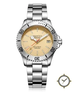 A Dive watch with a versatile 39.5mm case, that suits most wrists, crafted from stainless steel featuring a gold dial with a unique matte finish.