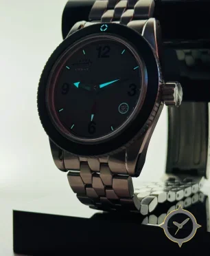 A Dive watch with a bold 44mm presence on the wrist, crafted from stainless steel featuring a black dial with a unique matte finish.