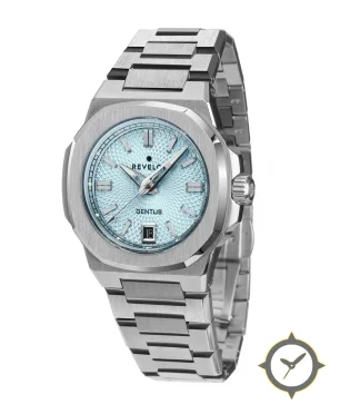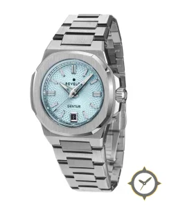 A Luxury watch with a bold 43.5mm presence on the wrist, crafted from stainless steel featuring a turquoise dial with a unique guilloché (waffle) finish.