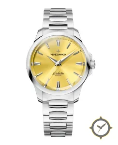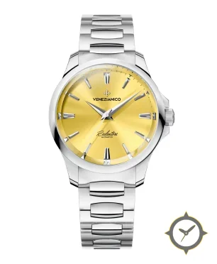 A Luxury watch with a vintage-inspired 34.5mm case, crafted from stainless steel featuring a gold dial with a unique sunburst finish.