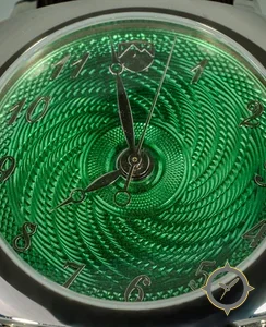 A Dress watch with a bold 44.5mm presence on the wrist, crafted from stainless steel featuring a green dial with a unique engine-turned guilloche (textured) finish.