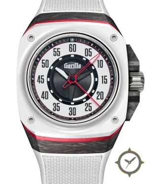 A Racing watch with a bold 46mm presence on the wrist, crafted from ceramic featuring a white dial with a unique brushed center with matte outer ring finish.