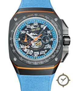 A Chronograph watch, crafted from titanium featuring a blue dial with a unique skeleton / openworked (exposed movement) finish and a true GMT complication for tracking a second time zone.