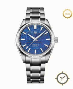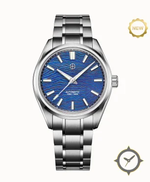 A Sports watch with a versatile 40mm case, that suits most wrists, crafted from stainless steel featuring a blue dial with a unique engraved wave texture finish.