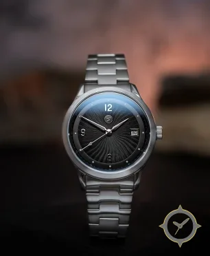A Sports watch with a bold 46.5mm presence on the wrist, crafted from stainless steel featuring a black dial with a unique guilloche / engine-turned finish.
