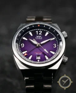 A GMT watch with a vintage-inspired 37mm case, crafted from stainless steel featuring a purple dial with a unique sunburst (faded gradient) finish and a true GMT complication for tracking a second time zone.