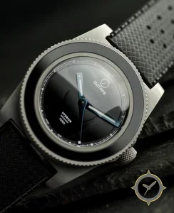 A Dive watch with a vintage-inspired 37.5mm case, crafted from titanium featuring a black dial with a unique glossy lacquer finish.