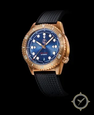 A Dive watch with a vintage-inspired 33mm case, crafted from bronze featuring a blue dial with a unique sunburst / wave guilloche finish.