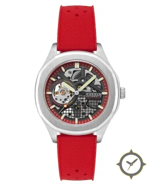A Skeleton watch with a bold 42.5mm presence on the wrist, crafted from stainless steel featuring a black dial with a unique open-worked/skeleton with visible movement and a red brushed chapter ring finish.
