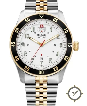 A Military watch with a vintage-inspired 36.5mm case, crafted from stainless steel featuring a white dial with a unique smooth lacquer finish.