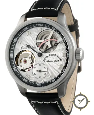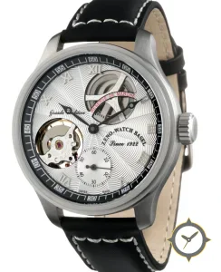 A Skeleton watch, crafted from stainless steel featuring a silver dial with a unique guilloche finish and a helpful power reserve indicator.