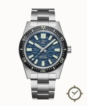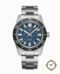 A Dive watch with a vintage-inspired 36mm case, crafted from stainless steel featuring a blue dial with a unique wavy texture finish.