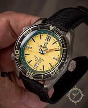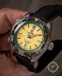 A Dive watch with a bold 43.5mm presence on the wrist, crafted from stainless steel featuring a yellow dial with a unique matte finish.