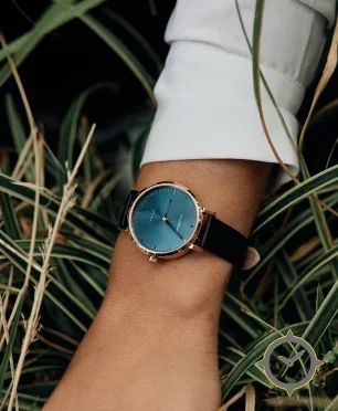 A Minimalist watch with a vintage-inspired 36.5mm case, crafted from gold featuring a blue dial with a unique sunburst finish.