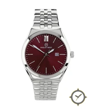 A Dress watch with a bold 43.5mm presence on the wrist, crafted from stainless steel featuring a crimson dial with a unique sunburst finish.
