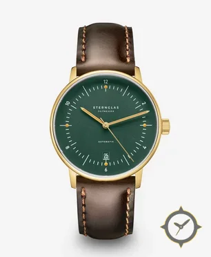 A Minimalist watch with a vintage-inspired 35.5mm case, crafted from gold featuring a green dial with a unique matte finish.