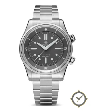 A Dive watch with a vintage-inspired 35.5mm case, crafted from stainless steel featuring a gray dial with a unique matte finish.
