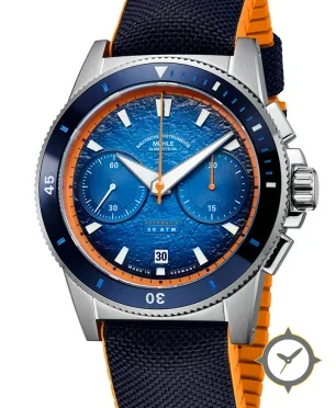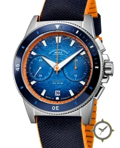 A Dive watch with a vintage-inspired 35mm case, crafted from stainless steel featuring a blue dial with a unique textured (wave/sea-like) finish.