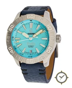 A Dive watch with a vintage-inspired 35.5mm case, crafted from stainless steel featuring a turquoise dial with a unique matte finish.