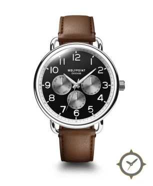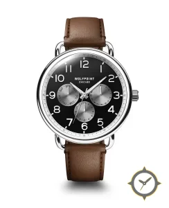 A Field watch with a bold 45mm presence on the wrist, crafted from stainless steel featuring a black dial with a unique matte black with sunburst silver subdials finish.