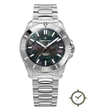A Dive watch with a bold 44mm presence on the wrist, crafted from stainless steel featuring a black dial with a unique iridescent mother-of-pearl finish.