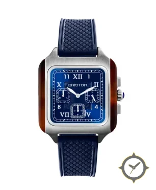 A Chronograph watch with a vintage-inspired 34mm case, crafted from stainless steel featuring a blue dial with a unique textured/guilloché center with printed minute track finish.
