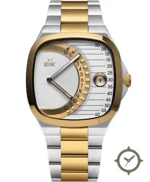 A Dress watch with a vintage-inspired 36mm case, crafted from stainless steel featuring a white dial with a unique horizontal engraved lines with concentric circular guilloché in the center finish.