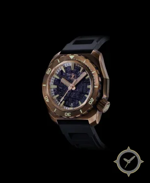 A Dive watch with a bold 46mm presence on the wrist, crafted from bronze featuring a black dial with a unique textured (meteorite-style) finish.