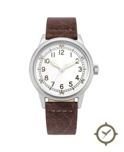 A Field watch with a vintage-inspired 33mm case, crafted from stainless steel featuring a white dial with a unique matte finish.