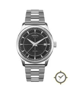 A Dress watch with a bold 44.5mm presence on the wrist, crafted from stainless steel featuring a black dial with a unique granular / grained (sandblasted effect) finish.
