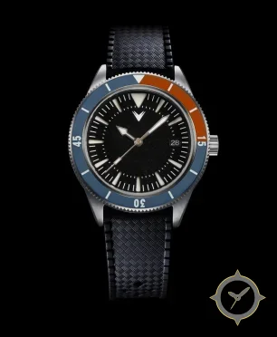 A Dive watch with a bold 43mm presence on the wrist, crafted from stainless steel featuring a black dial with a unique grained matte finish.