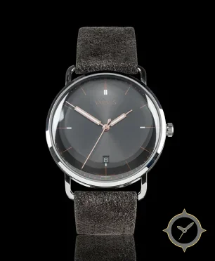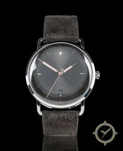 A Minimalist watch with a vintage-inspired 31.5mm case, crafted from stainless steel featuring a gray dial with a unique sunburst finish.