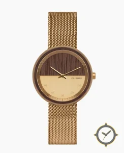 A Minimalist watch with a vintage-inspired 32.5mm case, crafted from stainless steel featuring a brown dial with a unique wood-grain finish.
