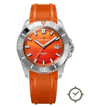 A Dive watch with a vintage-inspired 35.5mm case, crafted from stainless steel featuring a orange dial with a unique agate-like stone texture with slight sunburst finish.