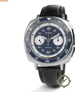 A Chronograph watch with a bold 44.5mm presence on the wrist, crafted from stainless steel featuring a blue dial with a unique textured/grained (speckled finish) finish.