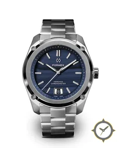 A Luxury watch with a vintage-inspired 35mm case, crafted from stainless steel featuring a blue dial with a unique brushed horizontal wave pattern finish.