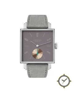 A Dress watch with a vintage-inspired 34mm case, crafted from stainless steel featuring a gray dial with a unique matte finish.