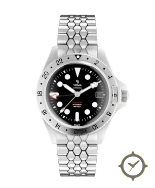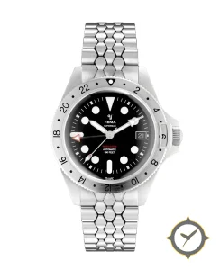 A GMT watch with a vintage-inspired 37mm case, crafted from stainless steel featuring a black dial with a unique matte finish and a true GMT complication for tracking a second time zone.