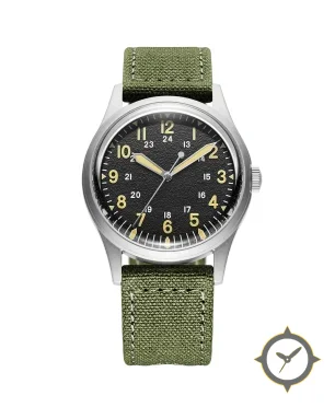 A Field watch with a bold 41.5mm presence on the wrist, crafted from stainless steel featuring a black dial with a unique textured/grained finish.