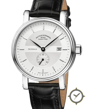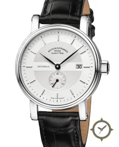 A Dress watch with a bold 48mm presence on the wrist, crafted from stainless steel featuring a white dial with a unique concentric guilloche center with smooth outer chapter ring finish.
