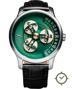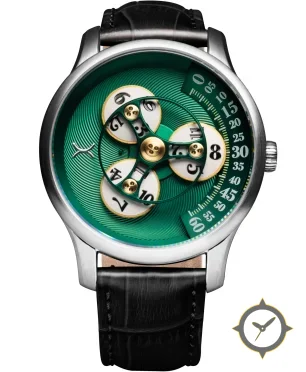 A Luxury watch with a vintage-inspired 36.5mm case, crafted from stainless steel featuring a green dial with a unique concentric guilloché (spiral) finish.