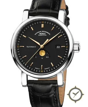 A Dress watch with a vintage-inspired 35mm case, crafted from gold featuring a black dial with a unique matte finish and a beautiful moonphase display.