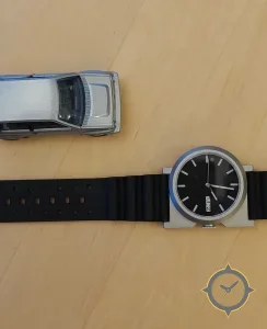 A Minimalist watch with a bold 45.5mm presence on the wrist, crafted from stainless steel featuring a black dial with a unique matte finish.
