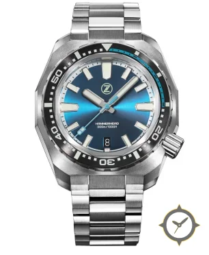 A Dive watch with a bold 52mm presence on the wrist, crafted from stainless steel featuring a blue dial with a unique sunburst finish.