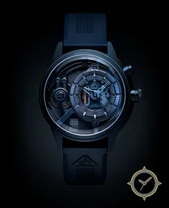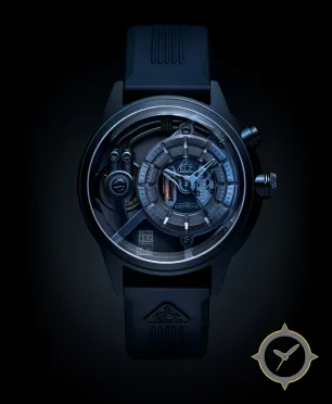 A Skeleton watch with a bold 51mm presence on the wrist, crafted from stainless steel featuring a black dial with a unique open-worked / skeletonised with visible mechanical and electronic components finish.