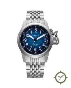 A Military watch, crafted from stainless steel featuring a blue dial with a unique textured/linen grain with subtle radial shading finish.