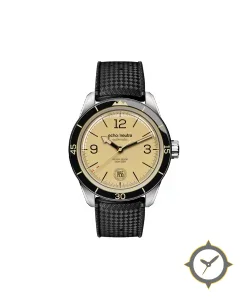 A Dive watch with a vintage-inspired 32.5mm case, crafted from stainless steel featuring a gold dial with a unique smooth matte finish.